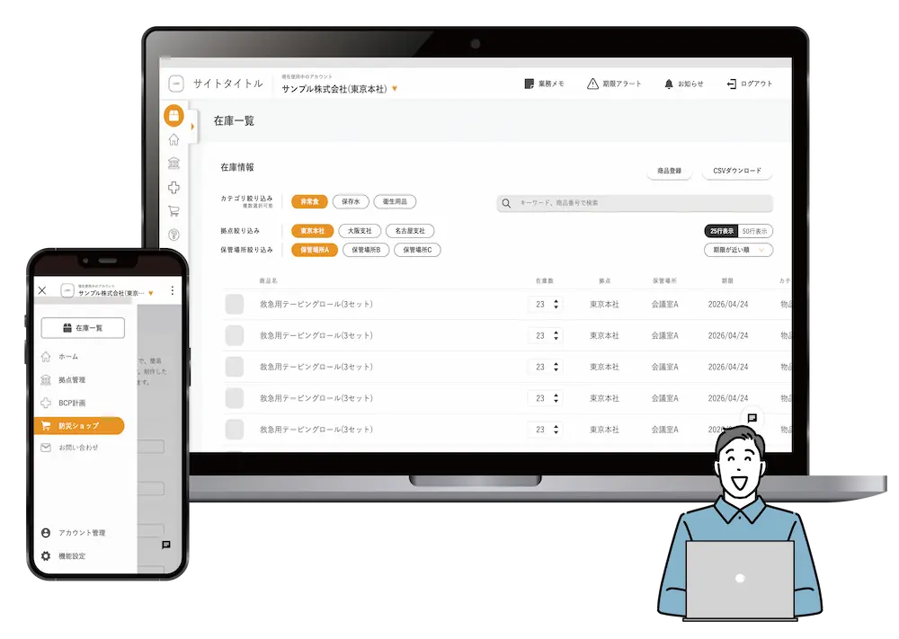 防災備蓄品の管理を行う倉庫システムです。防災用品・非常食の在庫管理は日常的に行うケースは稀だと考えています。 どこに、誰が、何個備蓄しているのかを災害が起こる前に備える事ができるフレキシブルで使いやすい在庫管理システムです。